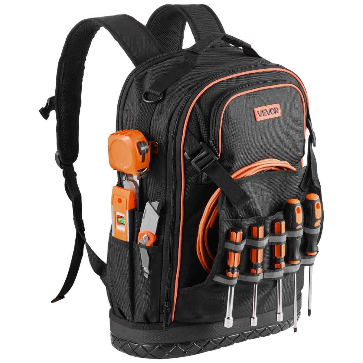 This tool backpack (14.56 x 7.67 x 20.47 inches) holds up to 70 lbs and features 65 pockets, including a removable divider. Ideal for wrenches, drills, and more! Plus, it has a laptop compartment and transparent pouch to keep your gear secure from damage or loss