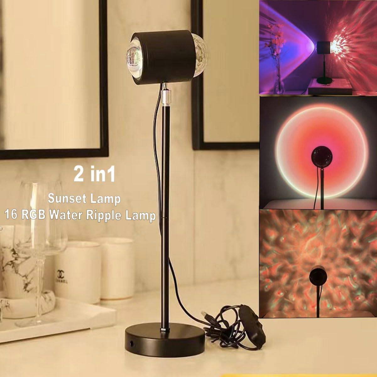 Water Ripple Lamp Sunset Lamp 2-in-1 3D Projector LED Light Sunset Ocean Light Project USB Powered Night Light 360° Rotation Button Control for Bedroom Photography Festive Atmosphere