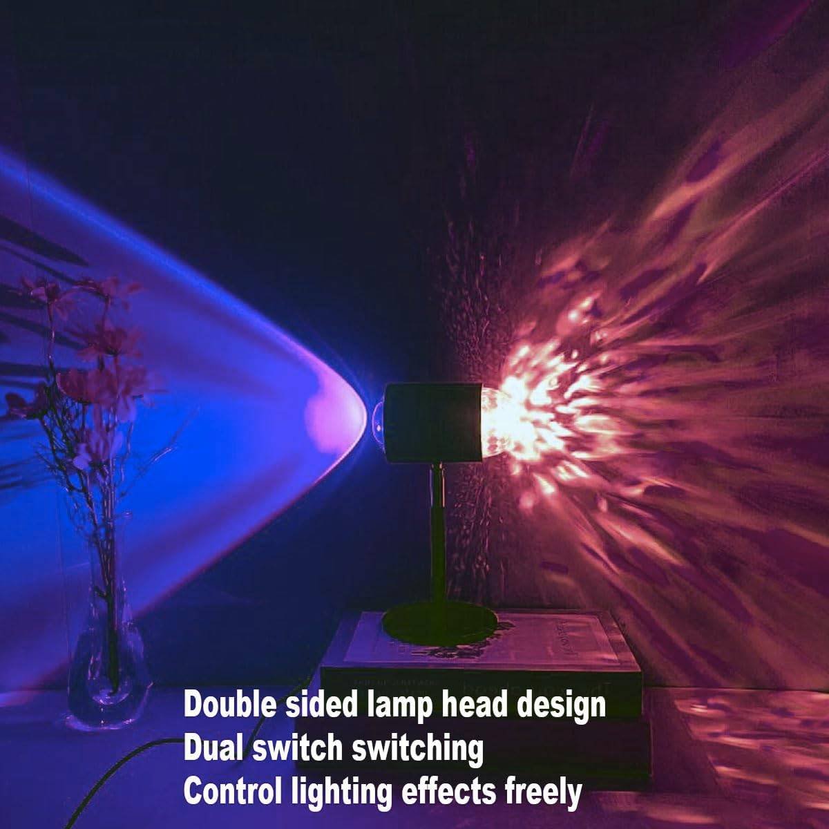 Double HeadThe Ocean Wave Lamp features a double head that creates a rich sunset or water effect, giving any room a unique atmosphere, as if you are watching a sunset on the beach.Controlled by Remote Control and ButtonsEquipped with a convenient remote control and buttons, you can easily adjust the light modes and the brightness of the light, whether it is sunlight, rainbow light or water light, you can do what you want.Aluminum Alloy ManufacturingSunset Lamp Projector Made of high quality aluminum alloy for good heat dissipation and durability, easy to use all night long. The iron antislip base ensures the lamp is stable and does not fall over.Portable Design Gift IdeaProjector light with USB charging interface, plug and play, can easily be powered by your phone, power bank or computer. Suitable for bedroom, living room, family gatherings, leisure or a romantic date, a good choice for a Christmas gift.
