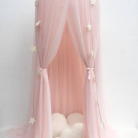 The canopy is intended to serve as a decorative element that enhances the personal space of a child. The classic dome shape is supported by a durable internal ring, ensuring the structure remains stable and elegant over time. Whether used to provide a sense of privacy or as a decorative mosquito net, this canopy offers a delightful retreat for children to enjoy their daily activities.