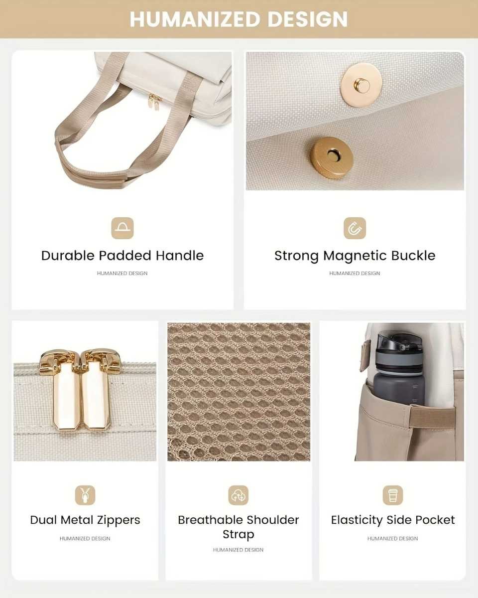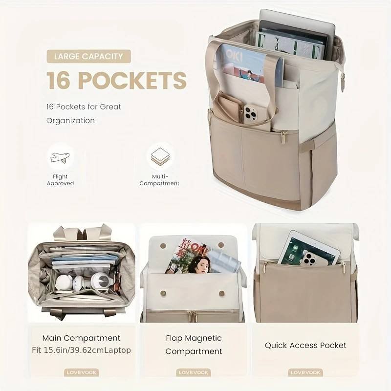 This multifunctional backpack is designed for travel, TSA compliant for direct carry-on boarding. It comes with a luggage fixing strap for easy attachment to a rolling suitcase, and a theft-resistant pocket on the back to keep your valuables secure. The interior features a user-friendly design: a durable, padded top handle for comfortable and effortless carrying, strong magnetic buckles for stability and peace of mind, double metal zippers for smooth and durable operation, breathable shoulder straps to reduce load sensation, and elastic side pockets that easily hold water bottles. With 16 compartments for detailed organization, the main compartment can fit a 15.6-inch laptop, while the magnetic flap compartment and quick-access pockets make item retrieval convenient. It flexibly adapts to both carry-on boarding and under-seat storage, meeting storage needs for travel, commuting, and various other scenarios.